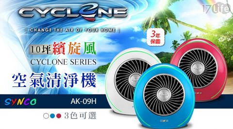 只要6,880元(含運)即可享有【SYNCO 新格】原價11,990元10坪繽旋風CYCLONE SERIES空氣清淨機(AK-09H)1台,顏色:白色/藍色/紅色,購買享3年保固!